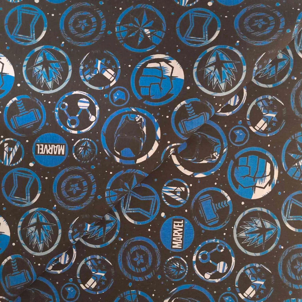 Tricoline Vingadores Azul fundo preto é o tecido ideal para os fãs dos super-heróis! Com uma estampa vibrante em azul sobre um fundo preto, este tricoline traz toda a energia e aventura dos Vingadores para seus projetos de costura.